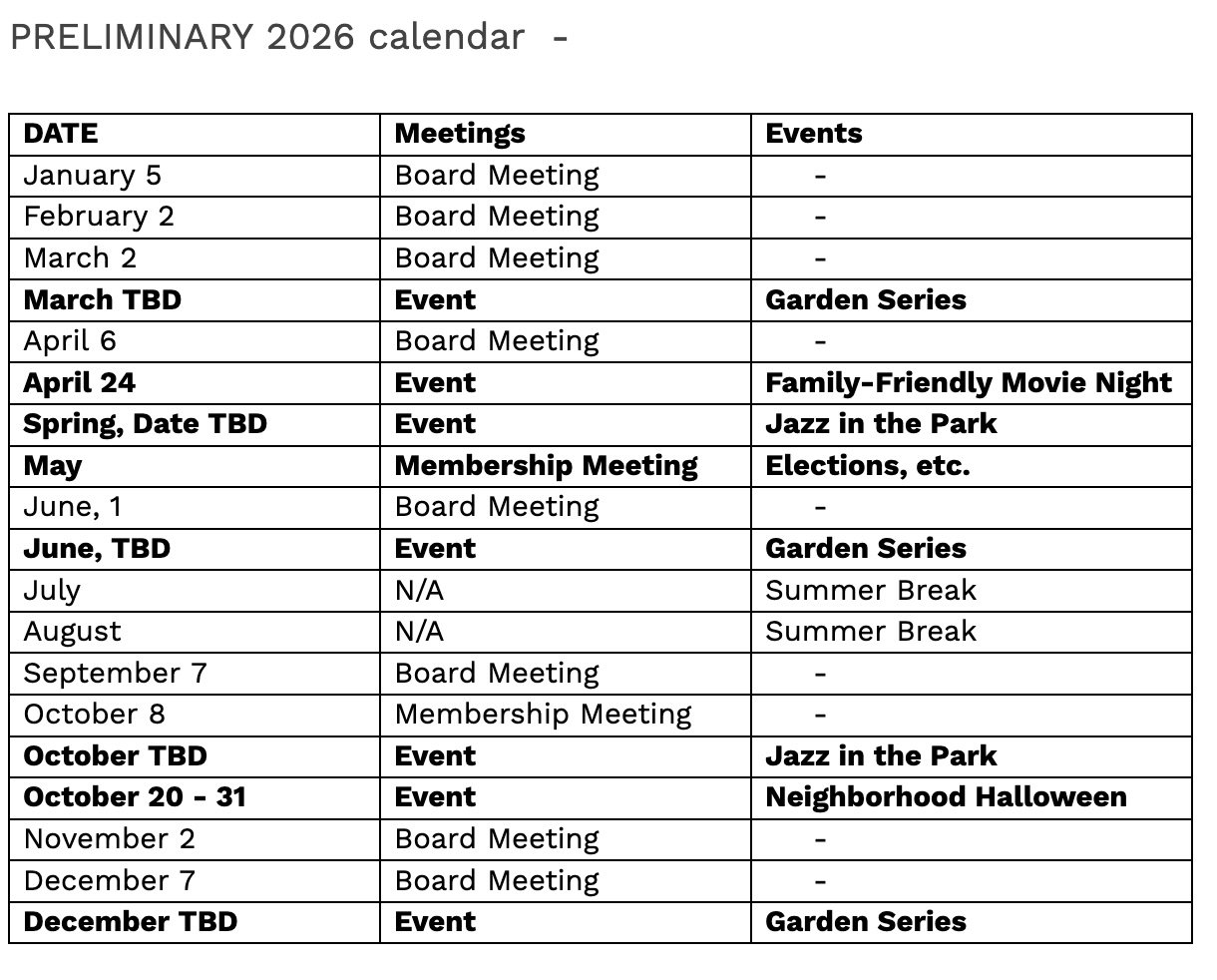 The Membership and Publicity Committee is responsible for maintaining an accurate and up-to-date membership roster, expanding the Association’s membership, and encouraging member participation in activities and initiatives. It also manages all communications and outreach efforts, including keeping members informed about neighborhood developments and city actions through the website, social media, and email updates. The committee oversees the publication of newsletters, external communications such as press releases, and timely information for the news media. Additionally, it promotes the Association’s role, raises awareness of its impact, and highlights the benefits of membership to strengthen engagement and community involvement.